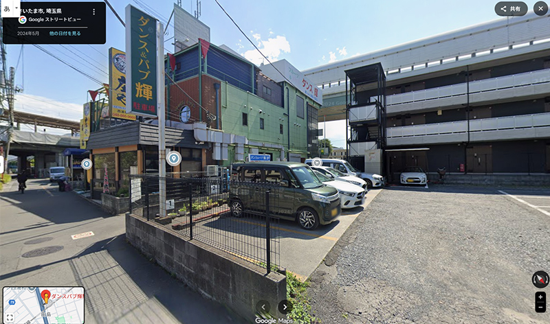 「ダンス&パブ 輝」 の看板がある駐車場です。